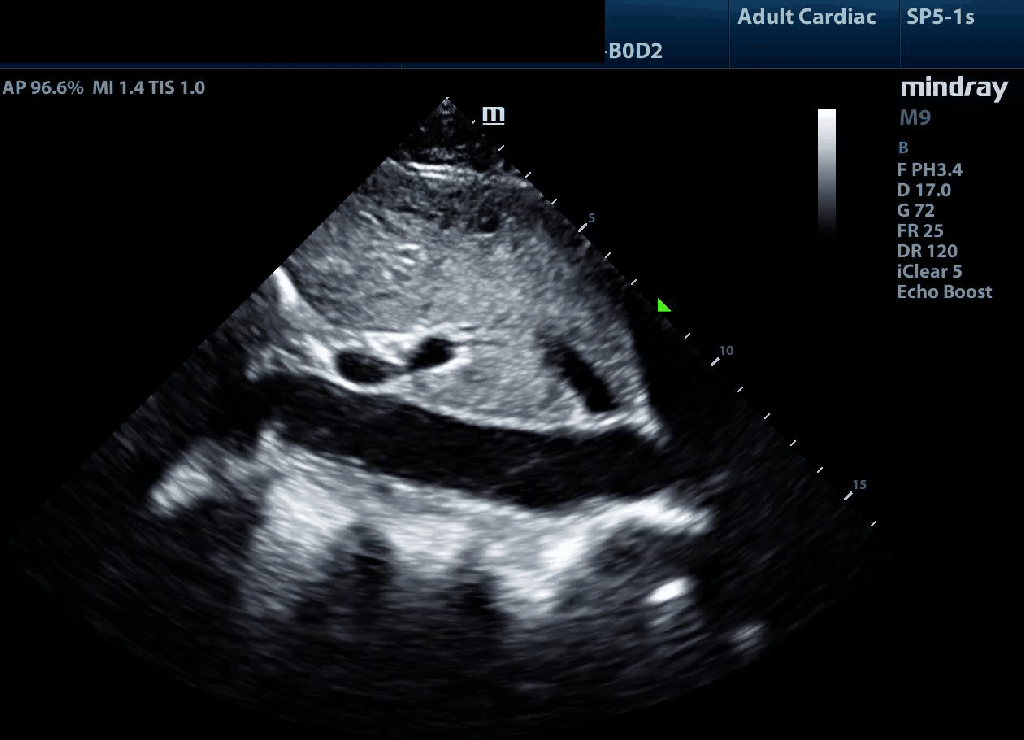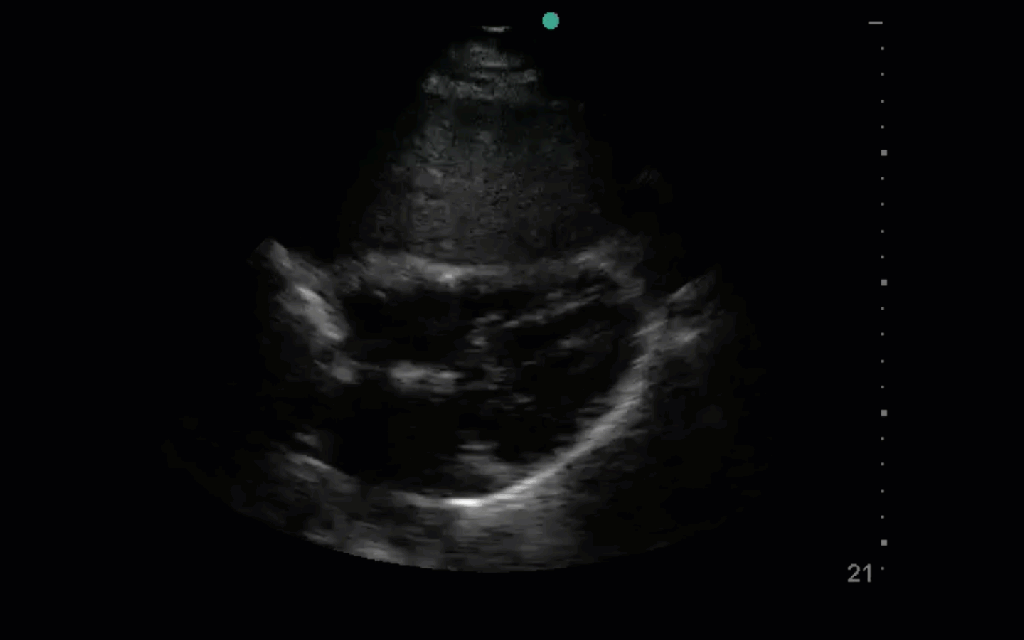 Place the transducer at the palpated apex, usually 4th-5th interspace midclavicular line, with the probe marker aimed towards the bed; often the final position is between the 2-3 o’clock position. Often you will need the patient in left lateral decubitus and may need to move quite lateral; the midclavicular line is only a starting point. The walls and septa of each chamber should be visualized as well as the tricuspid and mitral valve. LV function is evaluated to a lesser extent, but RV dilation and function are best evaluated here as well as major valvular abnormalities of the MV and TV.