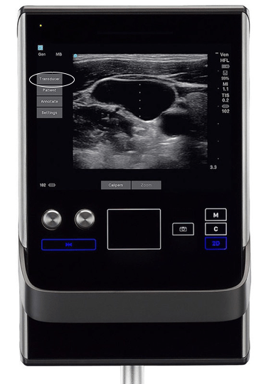 To access the exam preset, select ‘Transducer’ then one of the options from the subsequent drop down.