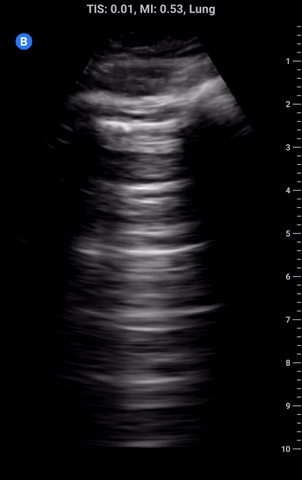 Vertical Artefacts (B-lines): More commonly known as B-lines these are also reverberation artefacts; their origin is controversial but there is evidence to suggest that they are from thickening of the interlobular septae (lung interstitium) causing acoustic traps. This thickening can be due to fluid, blood, inflammation, or fibrosis. In terms of appearance, they arise from the pleural line and project down greater than 10 cm of depth. Three or more B-lines in a single interspace is considered pathologic and should prompt a search for the presence of pathology in other lung zones. The presence of pathologic B-lines in 2 or more rib space bilaterally constitutes a diffuse interstitial syndrome. The differential for focal versus diffuse B-lines is discussed below