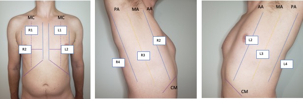 The chest is broken down into 8 zones with 4 zones per hemithorax. Zones R1-2 (R=right) and L1-2 (L = left) provide a survey of the anterior lung parenchyma while R3-4/L3-4 focus on detecting pleural/basal lung pathology.