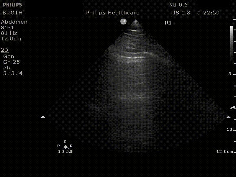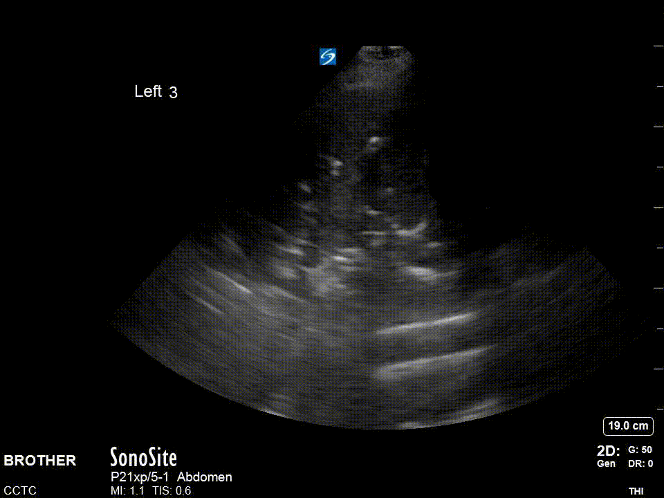 Pleural effusion: The presence of anechoic material above the diaphragm is indicative of pleural fluid. To call an effusion definitively you must be able to show the spine below the fluid on the screen. This is called “spine sign”. The presence of dark material above the diaphragm but without being able to see the spine may be an artefact. We discuss this in our ‘Pitfalls’ section.
