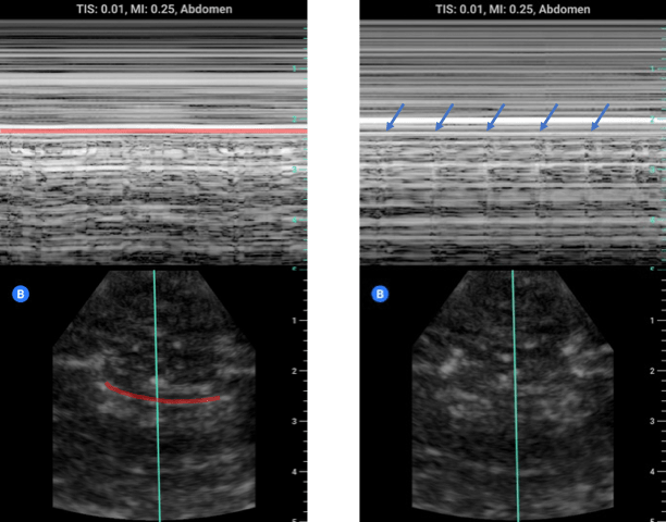 M-Mode and Pleural Sliding: In addition to B-mode imaging, M-mode can be used to assess for the presence of pleural sliding and lung pulse. In the image above on the left we see M-mode being used on a shallow lung view with the pleural line highlighted in red. Note the static soft-tissue/intercostal muscles above the line create layers of horizontal lines whereas BELOW the pleural line there is a scattered random pixel pattern. This is due to the motion of the intact pleural interface and the scatter from the lung parenchyma colloquially referred to as “sea shore” sign where the lung is the sand and the soft tissue the water. Even if the lung is not moving there should still be movement of the pleura from the heart/aorta creating a lung pulse which can be seen below the blue arrows.