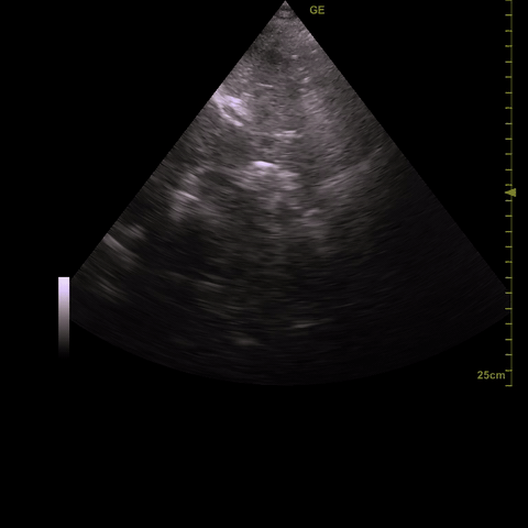 Use the phased array or curvilinear probe (though due to its smaller footprint and superior motion capture phased array is always preferred). If using the phased array with a cardiac exam preset, the screen marker will be on the RIGHT. Therefore, make sure the probe marker is to the patient’s LEFT. If using the curvilinear probe have the probe marker to the patient’s right. Identify the xiphoid process and move 2 cm down, then holding the probe at a 45 degree angle apply firm pressure and aim the beam towards the left shoulder. Once you have identified the heart fan (tilt) up and down scanning fully from anterior to posterior ensuring you are able to see the whole free wall of the RV to the apex.