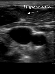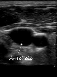 Gain: this can be thought of as the ‘brightness’. The higher the gain the whiter things get; the lower the gain the darker things get. Gain is a processing function and doesn’t change any of the characteristics of the ultrasound beam itself. Optimal gain is achieved when anechoic structures like fluid or blood are black and hypoechoic tissue like subcutaneous tissue or organs are grey and hyperechoic structures like arterial walls, pleura, and bone are white.