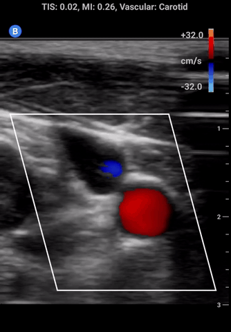 Colour doppler: in this mode a small window appears on the screen that detects the velocity and direction of flow which is represented using colour. At the side of the screen a colour scale will appear; the colour on top represents flow towards the probe and colour on the bottom away from the probe.