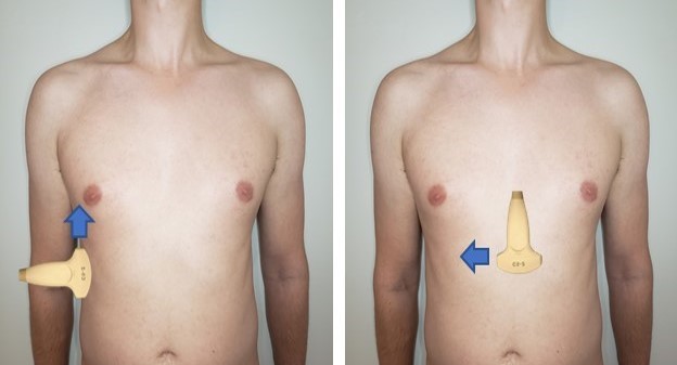 There are also 2 standard orientations to all scans: longitudinal with the probe marker towards the patient’s head parallel with the body from head to toe (shown below on the right), and transverse with probe marker to the patient’s right making an axial cut (left).