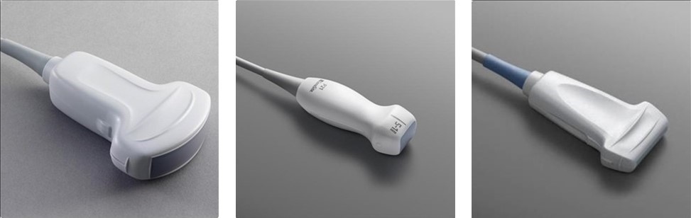 The most common types of ultrasound transducers or probes are the curvilinear (left), phased array (middle), and linear probe (right).
